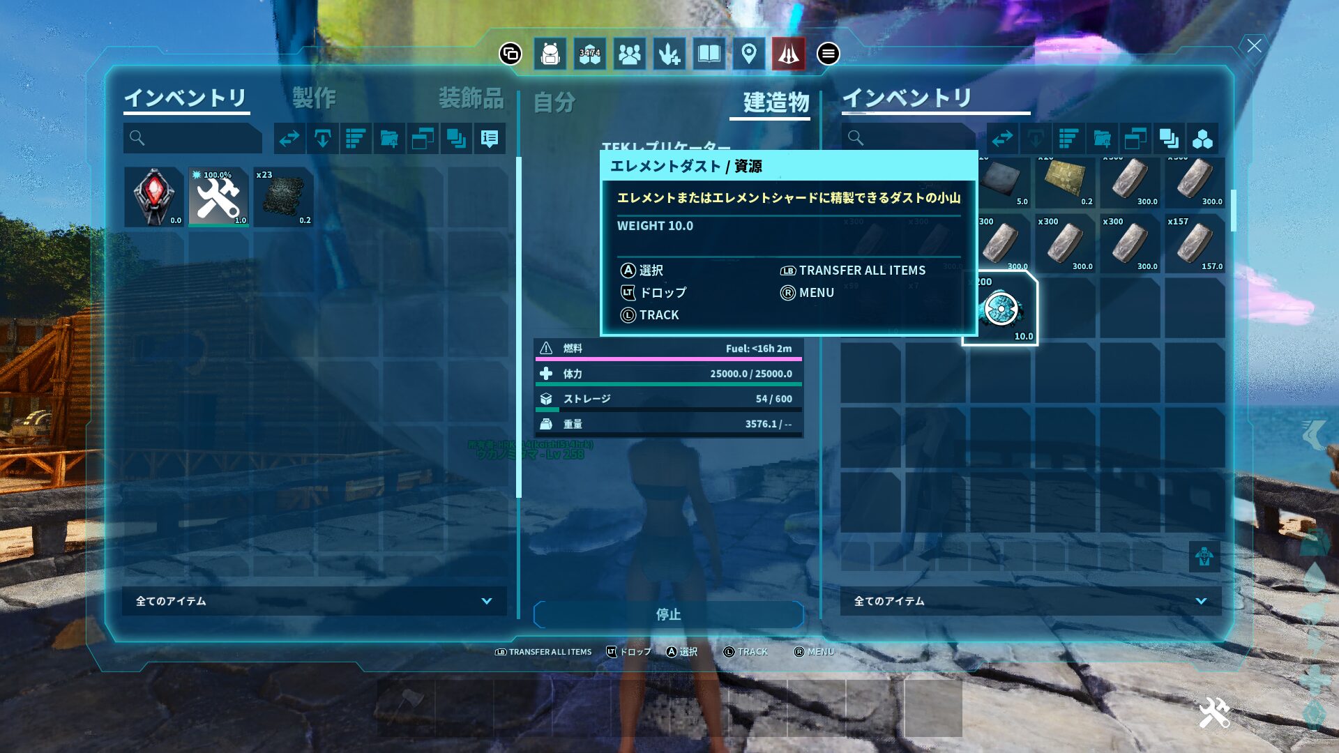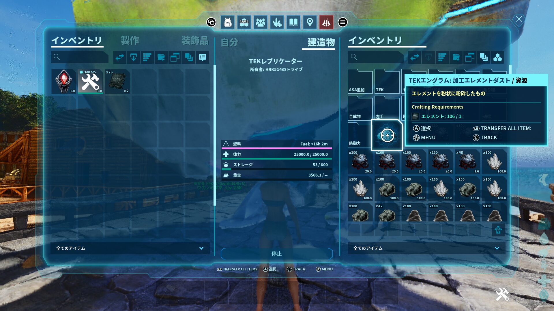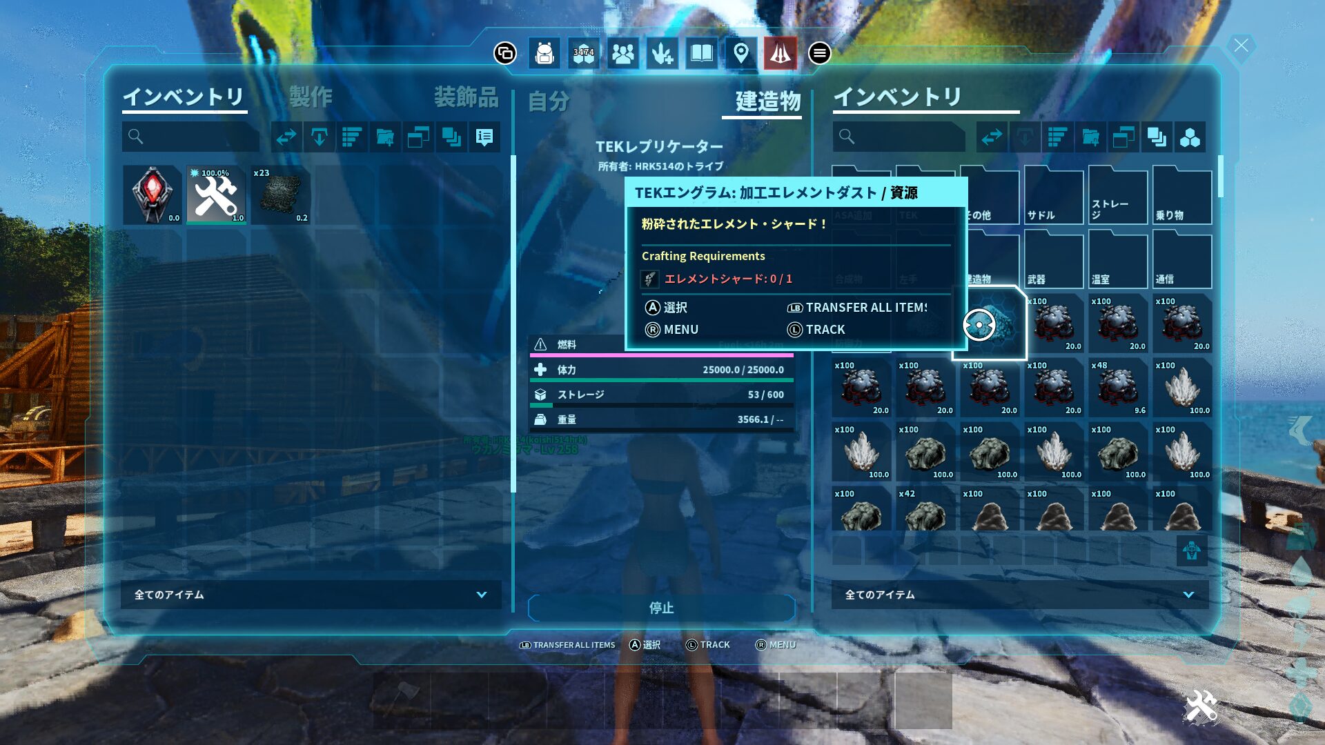 だからTEK生物を討伐するか、エレメントやエレメントシャードをTEKレプリケーターで変換するか、エクスティンクションやジェネシス2で採集したりして転送する必要があります