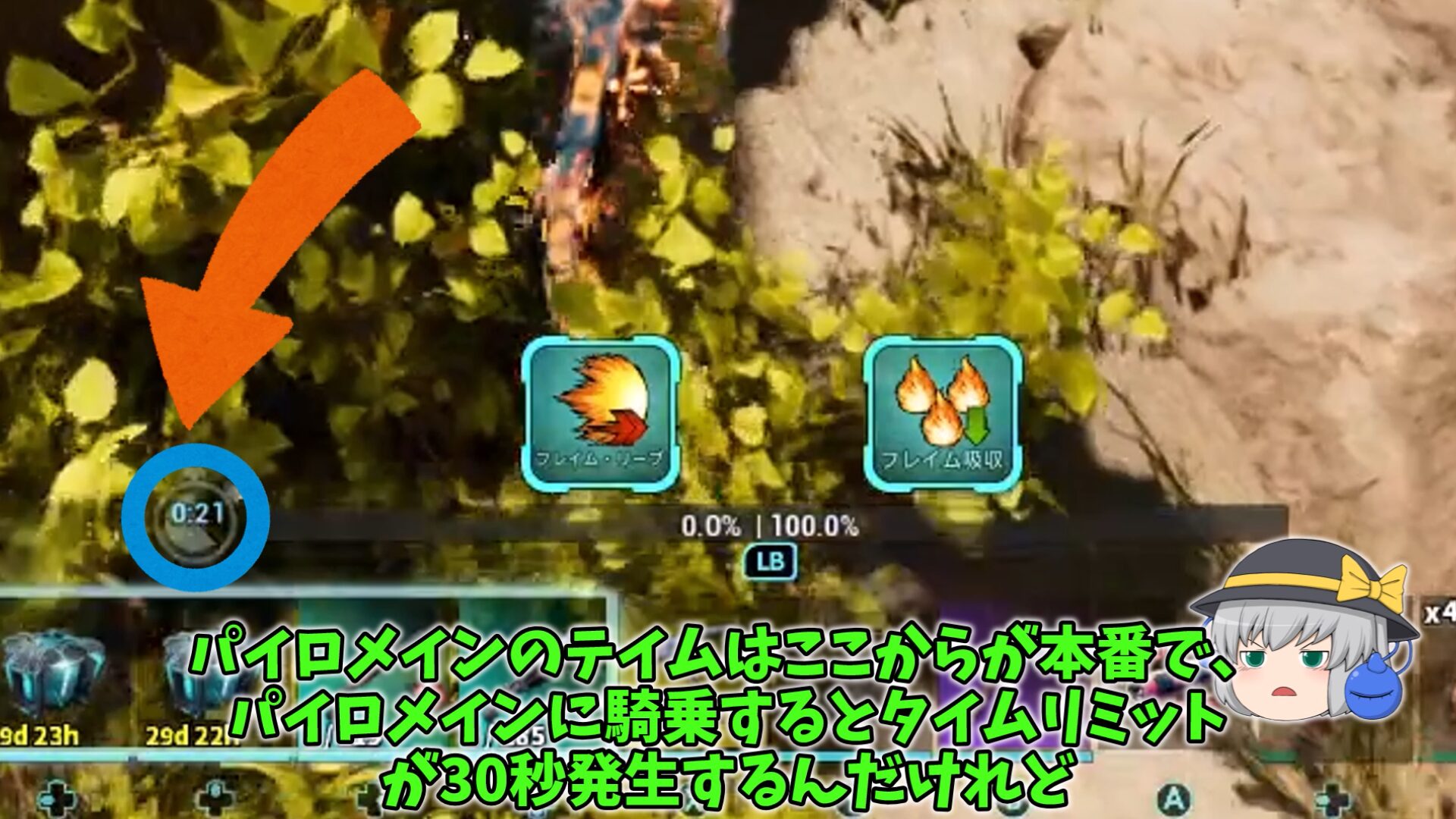 因みに動画で説明していなかった仕様の補足をすると、タイムリミットが残り10秒を切るとテイムボーナスが徐々に減少して、0秒になると強制騎乗解除されて再度体力を削るところからスタートしてしまい、騎乗解除から5分経過後に再度騎乗可能となって、10分を超えるとテイム値はリセットされてしまうんだ!それと自分から騎乗解除した場合も同様で5分経たないと再騎乗はできないです!