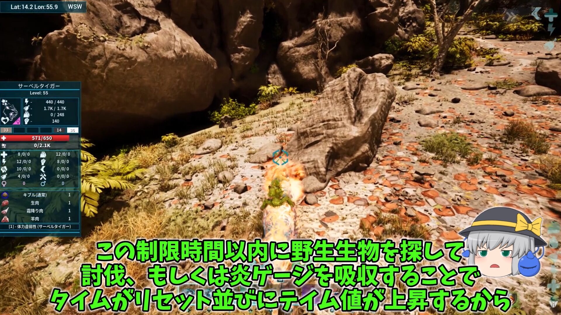 そしてアイテムスロットの上に30秒間のタイムリミットが表記されて、野生生物を倒すかオレンジ色のゲージがたまったらCtrlキーと右クリック(コントローラーの場合はR1+L2)で炎を吸収したらタイムリミットがリセットされて、テイム値も上昇していくんだ!そしてテイム値100%になるまで野生生物を倒すのと炎を吸収するのを繰り返します!