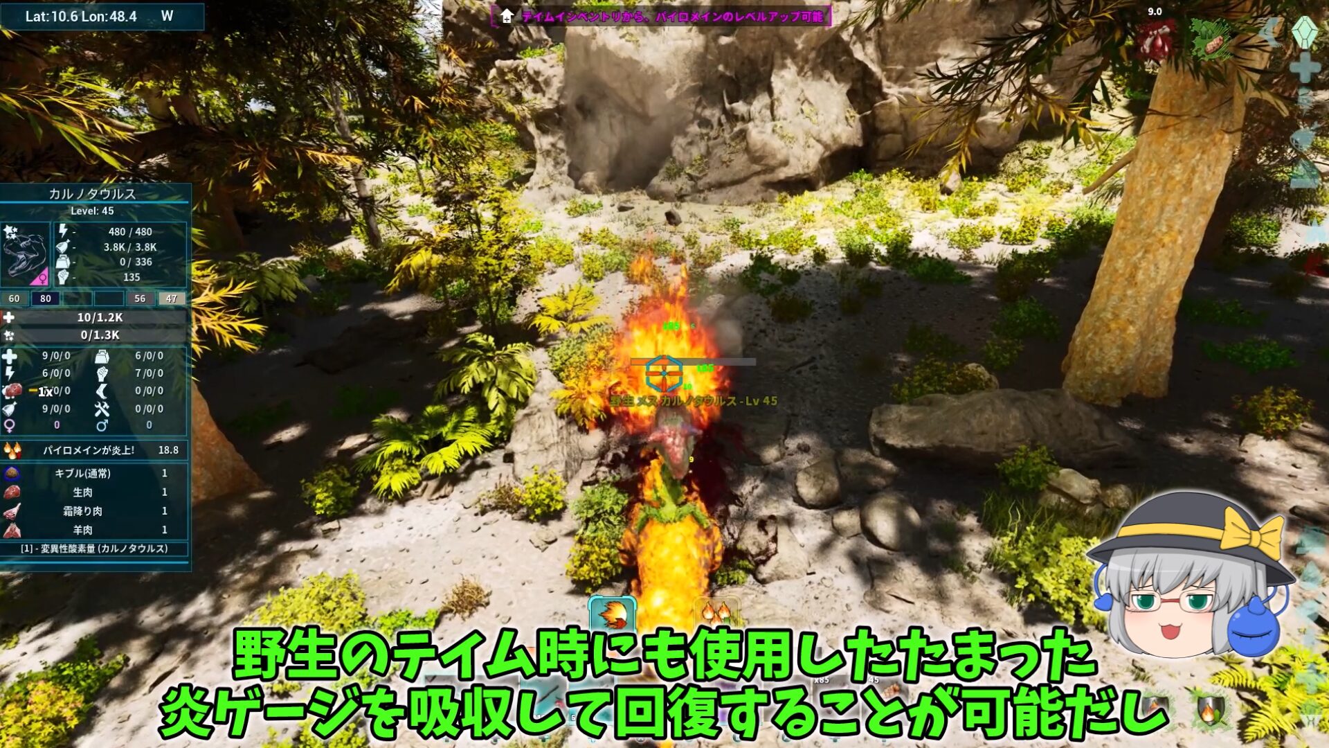 ただパイロメインは最初に削った体力が減った状態からスタートするから、ティラノみたいな強力な相手に挑むと最悪返り討ちにあってしまう関係上、この炎の吸収で体力を回復することはかなり重要となるわ