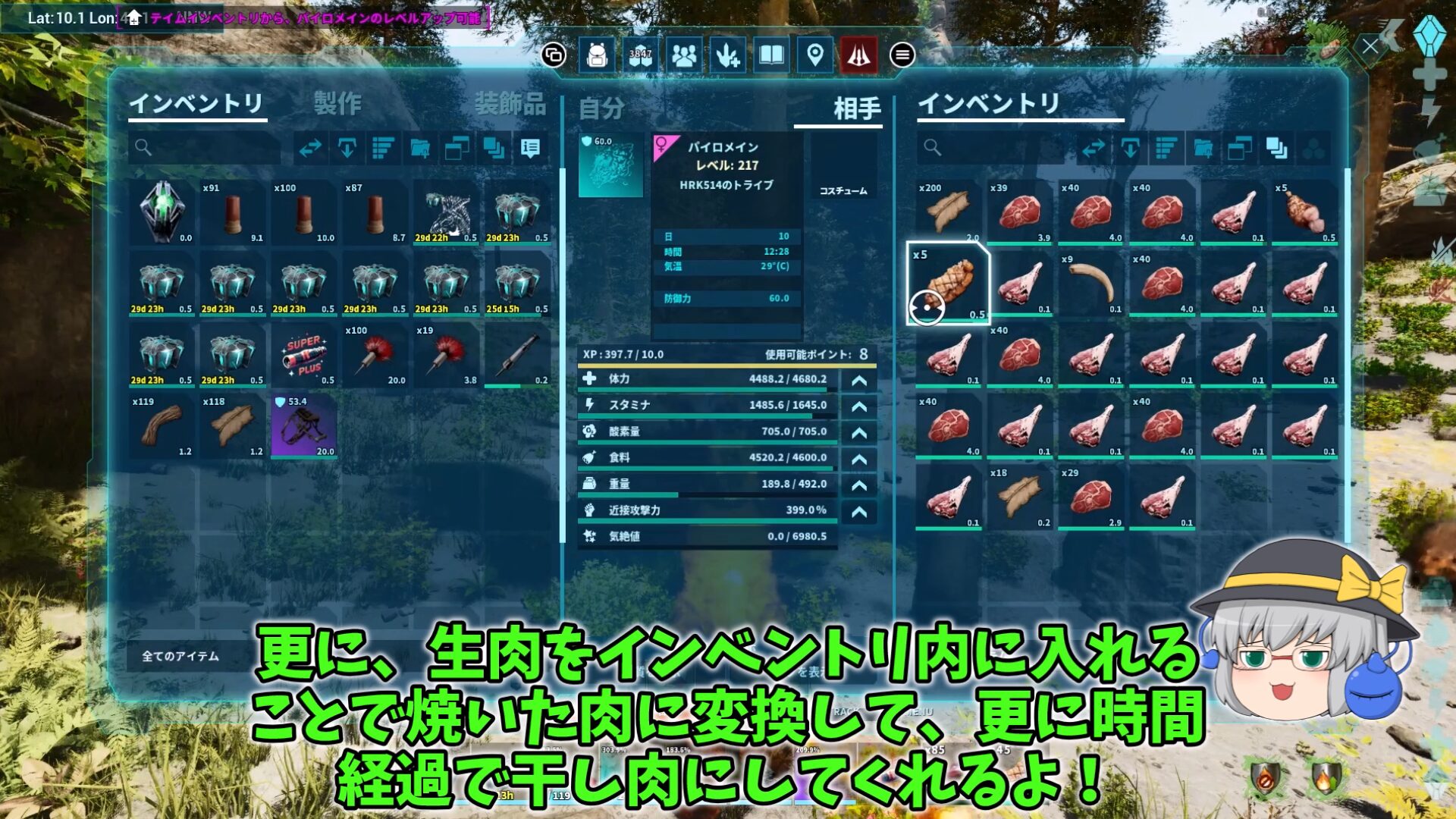 おぉ!インベントリ内に生肉を入れておくと時間経過で焼けた肉になって、更に時間が経つと干し肉にも変換してくれるんだな!
